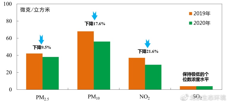 2020年北京市大氣環(huán)境中PM2.5等四項(xiàng)主要污染物同比均明顯改善,其中PM2.5年均濃度為38微克/立方米,首次達(dá)到“30+”水平,同比下降9.5%;可吸入顆粒物(PM10)、二氧化氮(NO2)連續(xù)兩年達(dá)到國家二級標(biāo)準(zhǔn);二氧化硫(SO2)年均濃度穩(wěn)定達(dá)到國家標(biāo)準(zhǔn)并保持個位數(shù)水平。