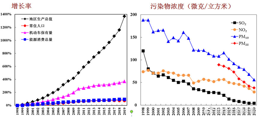 (圖10 1998年以來北京市地區(qū)生產(chǎn)總值、常住人口、機(jī)動車保有量、能源消耗總量增速與各項(xiàng)污染物濃度變化趨勢)